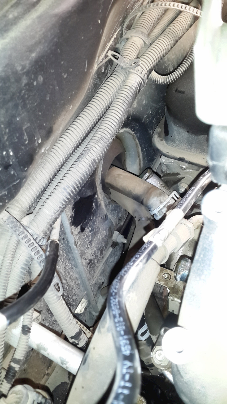 Четвертый — это закрутить обратно маленький саморезик, что в районе патрубков соединяет кронштейн печки, корпус испарителя и кузов. Никак не хотели совпадать все три отверстия! Для решения ослабил один из двух доступный саморез крепления кронштейна к печке, после этого легко закрутил маленький саморезик на место и подтянул саморез кронштейна.