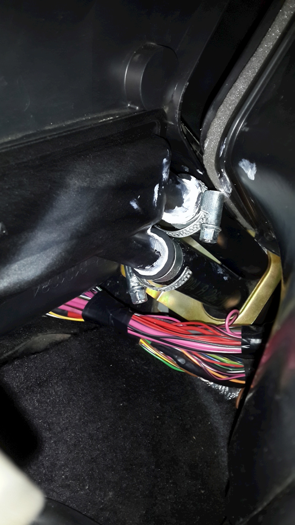 Как видите сколхозил только один раз из-за недостатка времени и нервов. А так рулевое колесо, подрулевые переключатели, рулевой вал, круглые болты рулевой колонки, все педали, улитка и испаритель остались на месте не тронутые, соответственно фреон спускать не пришлось, больше ничего не пилилось, не гнулось, не разламывалось и не выламывалось, весь крепеж использован, остался только один саморез, замененный проволокой, а родной радиатор на родном месте продолжает радовать))
