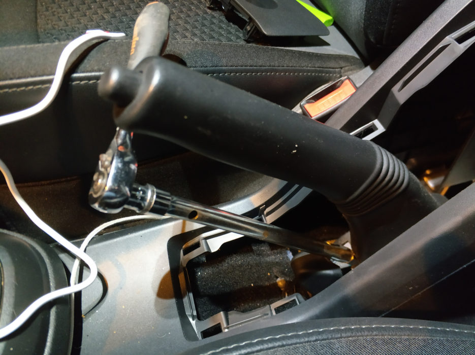 - Отодвигайте защиту, пока перед вами не возникнет механизм настройки стояночного тормоза.