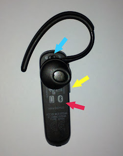 - Жёлтая стрелка показывает на регулятор громкости. При прослушивании аудиокниг через bluetooth-гарнитуру Jabra EasyGo этот регулятор тоже работает, сопровождая нажатия громкими бипами.