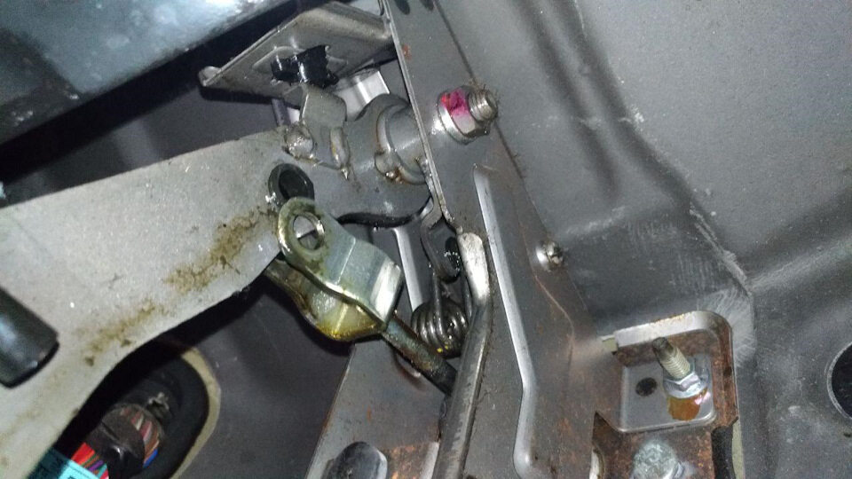 Возвратная пружина скрипит сама по себе, или задевая кронштейн. Применять моторное масло, чтобы смазать ее, не стоит: пачкается салон, а ВД40 выручает на несколько дней. Применяем смазку ШРУС, которая продается в банках или тюбиках. Тюбик в данном случае более удобен для использования.
