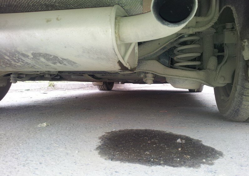 Маслянистая лужица под трубой выхлопа может указывать на износ цилиндропоршневой группы либо сальников клапанов. Моторная смазка, проникая в цилиндры, сгорает и частично выбрасывается в газоход и смешивается с конденсатом. Неполадка сопровождается дымом сизого цвета, нагаром на электродах свечей и повышением расхода масла в двигателе.