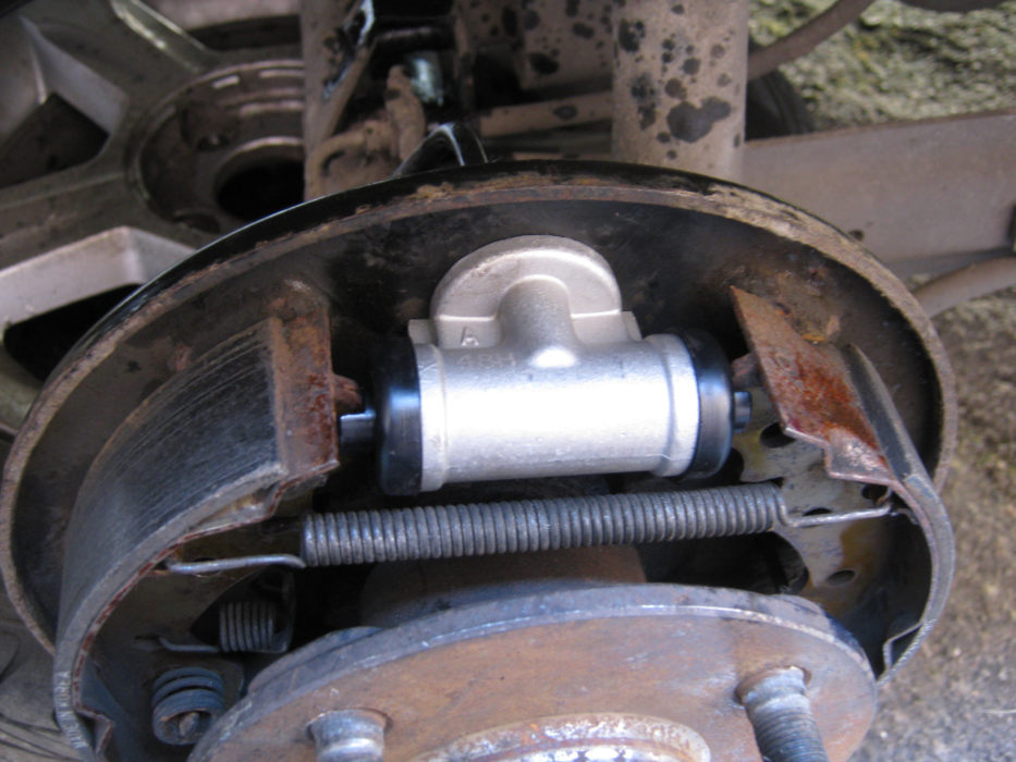 Задний тормозной цилиндр находится под барабаном заднего колеса. Чтобы получить к нему доступ, нужно снять колесо, затем вытащить барабан.