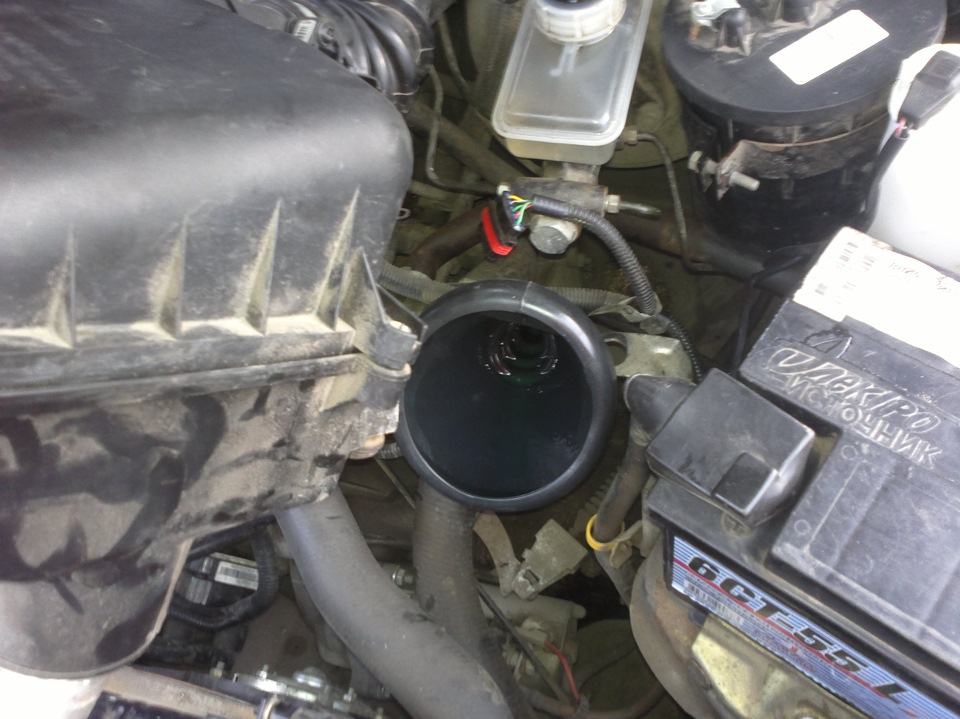 - В отверстие для замены масла, из которого вы доставали щуп, вставляем воронку.