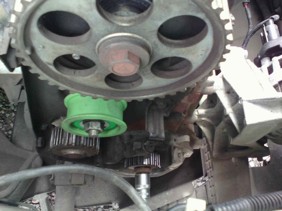 Если фазы газораспределения выставлены неправильно, то необходимо открутить натяжной ролик и скинуть с шестерни ремень. После чего вращением коленвала добиться совпадения и одеть ремень обратно.