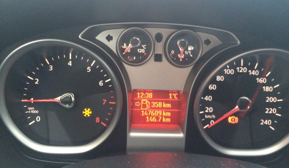 На дорестайлинговых моделях Ford Focus 2 и 3 индикатор снежинка горит поначалу желтым, а как только температура понижается до минусовой — загорается красным цветом.