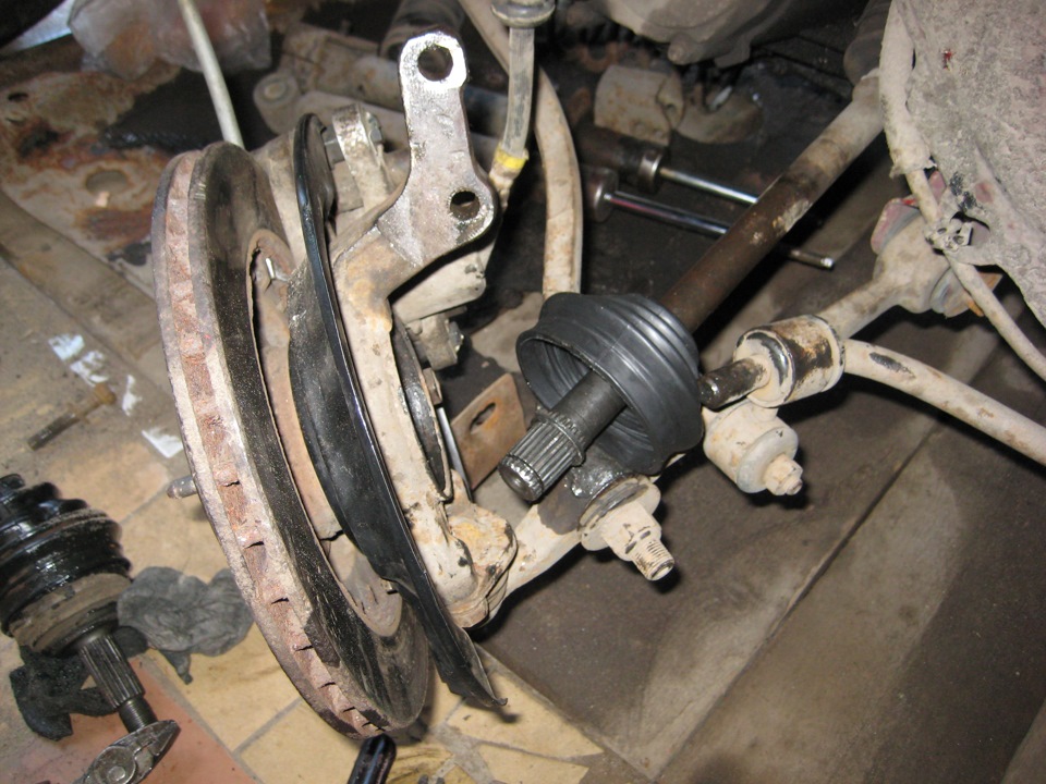 - Теперь нужно вытянуть шпицевой конец наружного ШРУСа с ВАЗ-2109, только после того, как уже оттянута стойка и поворотный кулак. Далее выдавите внутренний ШРУС, который прикреплен в КПП. Для этого лучше применить монтировку.