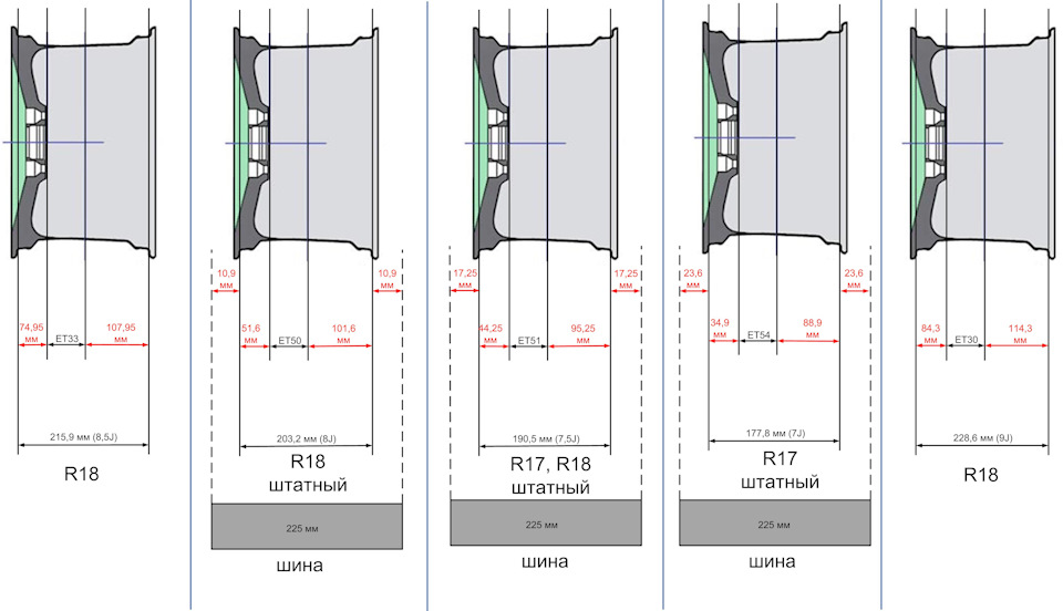Все перечисленные выше показатели в узких диапазонах могут быть заменены аналогами, так как отклонение в -2 см особо не влияет ни на скоростные качества транспортного средства, ни на непроектные нагрузки на посадочный узел, и автомобиль может эксплуатироваться с шириной колеса 6J даже если производитель советует 5,5J.